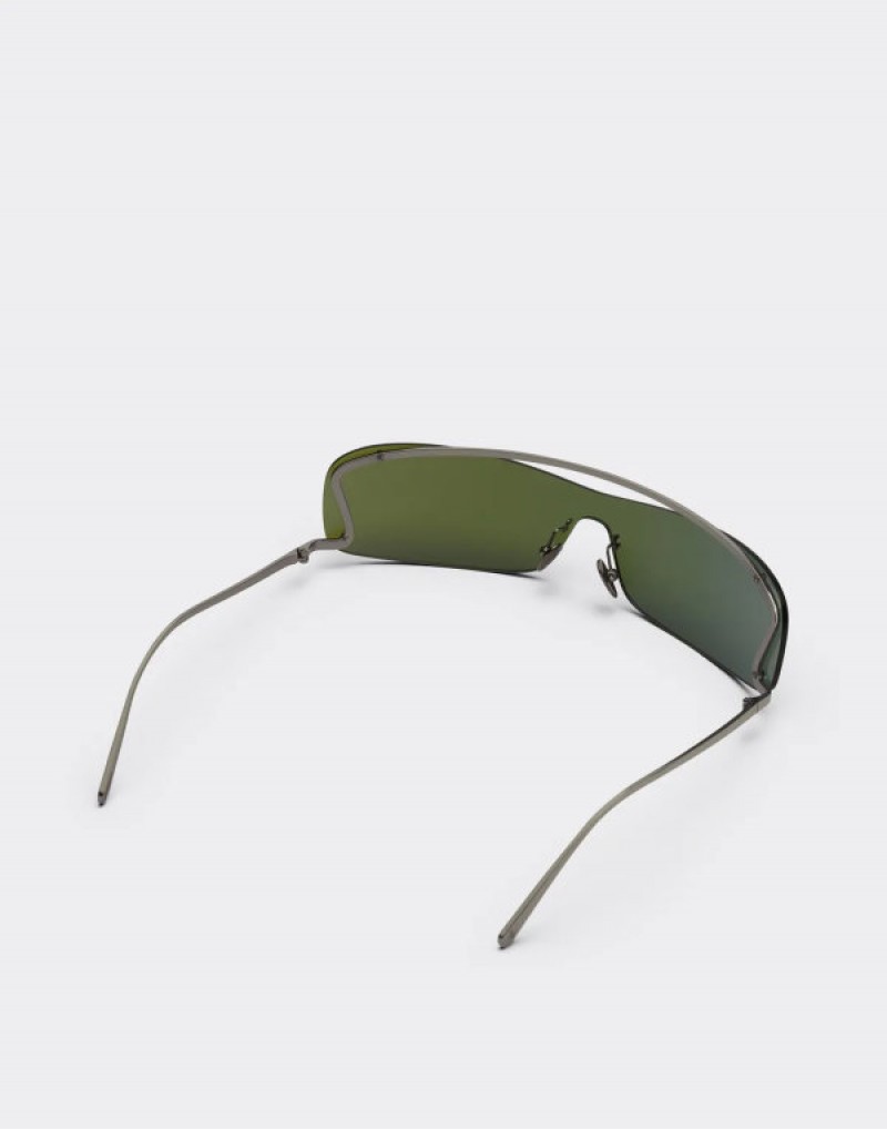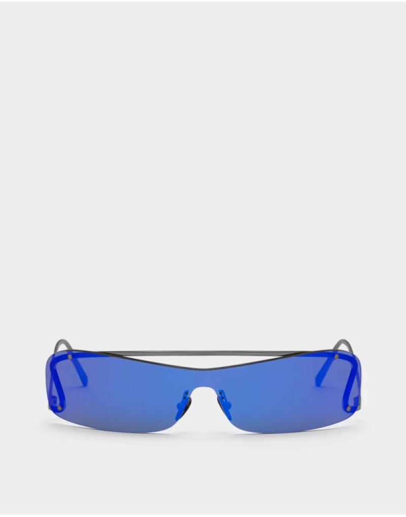 A fluid and enveloping design characterizes these mask sunglasses with a thin metal retro-structure that continues along the sides of the frame to create the shape of the temples. The complexity of the construction of the unisex model, created by combining and overlapping the different elements, reveals unique lines.
